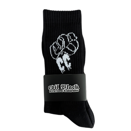 Available in bold black or clean white, these Crew socks are comfortable & light weight and are a must have staple for your Evil Black Clothing wardrobe. With the EBCC logo dominant on the side of the sock, it makes a statement that you are down with the EvilBlack crew all the way.
