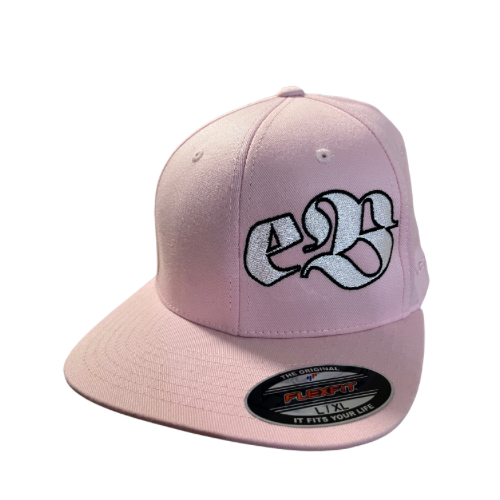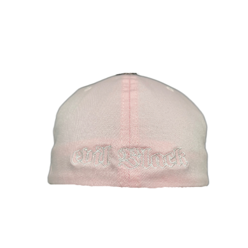 The Women's Pink Gasoline Flex Cap features a large Evil Black EB Logo embroidered on the left front panel in full white with black outline stitching. On the back of the cap is Evil Black CC in white outline stitching.