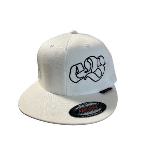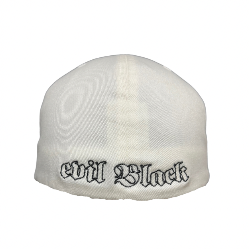 The Men's White Gasoline Flex Cap features a large Evil Black EB Logo embroidered on the left front panel in black outline stitching. On the back of the cap is Evil Black CC in black outline stitching.
