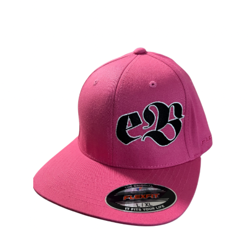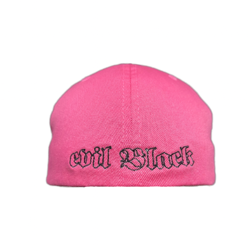 The Women's Hot Pink Gasoline Flex Cap features a large Evil Black EB Logo embroidered on the left front panel in full black with white outline stitching. On the back of the cap is Evil Black CC in black outline stitching.